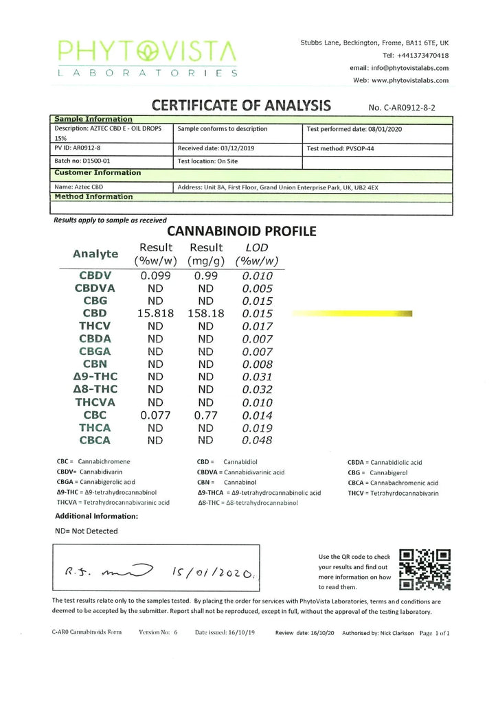 CBD Oil drops is 100% natural cannabidiol oil, CBD (cannabidiol) is an active substance found in hemp oil. It is perfectly legal and safe to use. CBD has no side effects and is not addictive. Aztec CBD oil drops is non-psychoactive and the content of THC is tested on every batch to meet specification requirements of less than 0.05%.