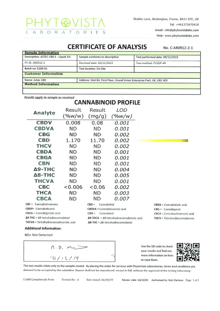 CBD (cannabidiol) is an active substance found in hemp oil. It is perfectly legal and safe to use. CBD has no side effects and is not addictive. Aztec CBD e liquid is non-psychoactive and the content of THC is tested on every batch to meet specification requirements of less than 0.05%.