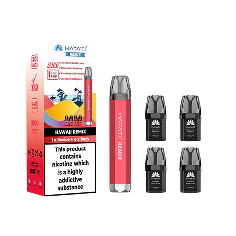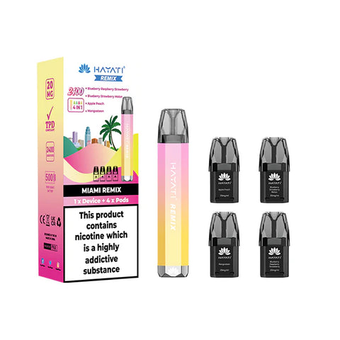 Hayati Remix 2400 4 in 1 Pod Kit. Unleash the potential of innovation, designed specifically for sublime MTL vaping. Featuring a rechargeable 500mAh battery, this device provides up to 2400 puffs of uninterrupted vaping enjoyment. Experience the ultimate vaping experience with the Hayati Remix 4in1 2400 Pod Kit. Each kit contains four Prefilled Pods, bursting with 2ml of Nic Salt E-liquids at 20mg strength. Enjoy up to 600 puffs per pod of mouth-watering flavour. Elevate your senses and experience true satisfaction. With over 300 full charges available from one device, this device will leave both your tastebuds and bank satisfied.