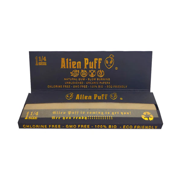 50 Alien Puff Black & Gold 1 1/4 Size Unbleached Brown Rolling Papers ( HP104 )